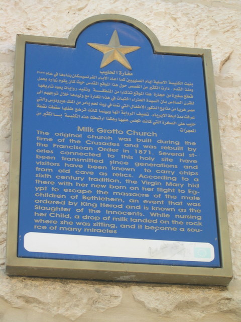 This church was built by St. Paula, who lived in Bethlehem and died there in 404 A.D., this church was naturally dedicated to the Virgin Mary, but at one time was called St. Paula (either by mistake by the builder or for one of the numerous other churches built in Bethlehem by St. Paula). In the 14th Century this church was known as the Church of St. Nicholas, as shown in a Papal Bull of Gregory XI in 1375, authorizing the Franciscans to rebuild it, which was not then done. The Franciscans first took possession of the church sometime after 1347 after they became caretakers of the Sanctuary of the Nativity. The soft white stones in this church were exported to many European churches under the name of The Virgin's Milk. It was one of these relics that Gerard III, Bishop of Bethlehem, took to the camp of King Baldwin III during the siege of Ascalon in 1153.